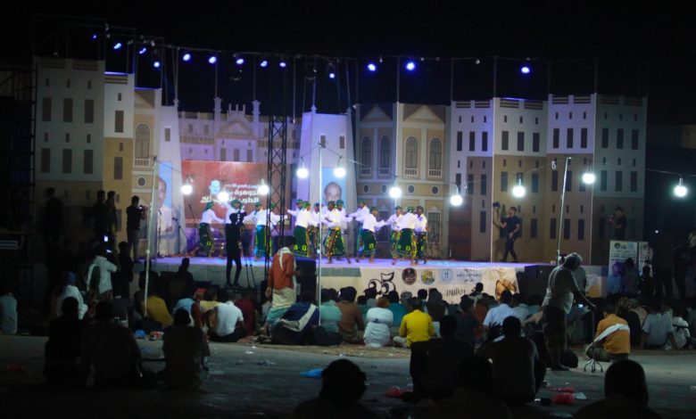 ختام كرنفالي مبهر لليوبيل الفضي لرحيل جوهرة الطرب بدوي زبير في مدينة الشحر ديكور مسرحي يجسّد شبام والشحر في لوحة فنية ساحرة