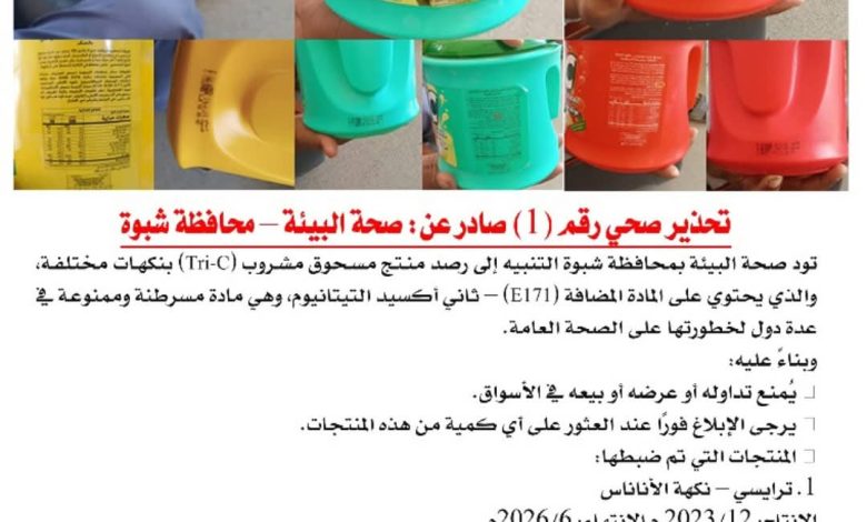 حيث أكد مكتب صحة البيئة بمحافظة شبوة التنبيه إلى رصد منتج مسحوق مشروب (Tri-C) بنكهات مختلفة، والذي يحتوي على المادة المضافة (E171) – ثاني أكسيد التيتانيوم، وهي مادة مسرطنة وممنوعة لخطورتها على الصحة العامة.