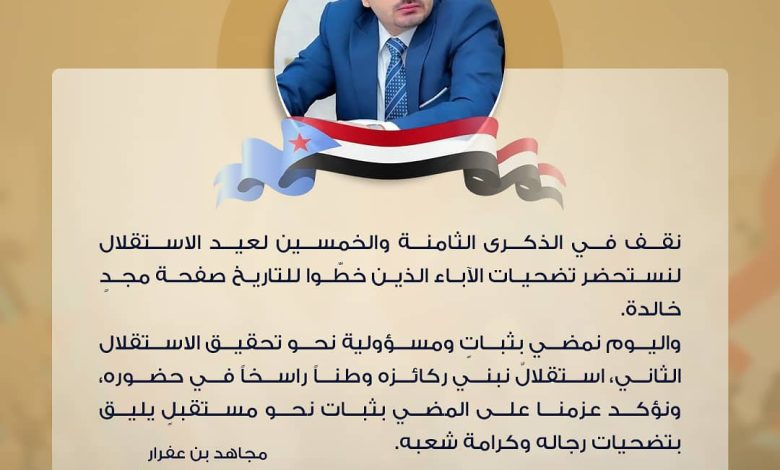 وقال بن عفرار في تغريدة على حسابه الشخصي في منصة (إكس) العالمية ‏: نقف في الذكرى الثامنة والخمسين لعيد الاستقلال لنستحضر تضحيات الآباء الذين خطوا للتاريخ صفحة مجد خالدة.