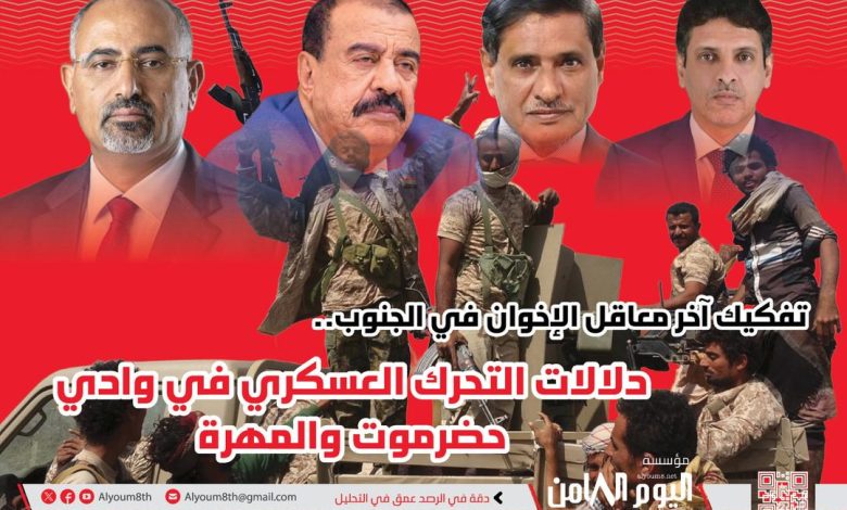 قالت مؤسسة اليوم الثامن للإعلام والدراسات إن محافظة حضرموت تقود تحولًا مفصليًا في المشهد العسكري والسياسي جنوب اليمن، بعد بدء تفكيك آخر معاقل النفوذ التابع لجماعة الإخوان في وادي وصحراء حضرموت، في ظل تحركات متسارعة للقوات المحلية المدعومة بتأييد شعبي واسع.