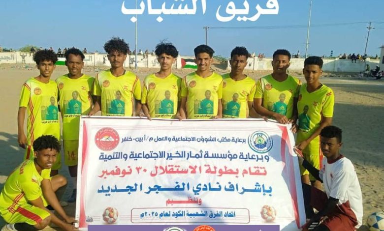 حسم فريق الشباب معركة التاهل بينه وبين فريق الخامله في المباراة التي جرت بينهما عصر اليوم على ملعب نادي الفجر الجديد في دوري الاستقلال 30نوفمبر للفرق الشعبية بالكود الذي ينظم برعاية مؤسسة ثمار الخير الاجتماعية والتنموية ورعاية مكتب الشوؤن الاجتماعية والعمل محافظة أبين وبإشراف إدارة نادي الفجر الجديد وتنظيم إتحاد الفرق الشعبية بالكود خنفر