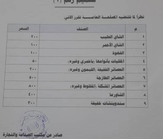 مكتب الصناعة والتجارة بالشحر يصدر قائمة بأسعار الوجبات الخفيفة والمشروبات بالمديرية