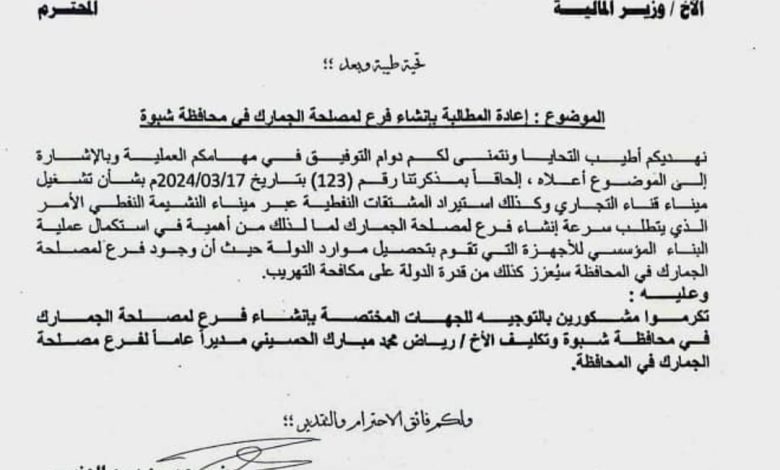 الموضوع: إعادة المطالبة بإنشاء فرع لمصلحة الجمارك في محافظة شبوة.