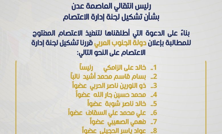 على الجميع التعاون مع اللجنة لضمان نجاح الاعتصام المفتوح للمطالبة بإعلان دولة الجنوب العربي.