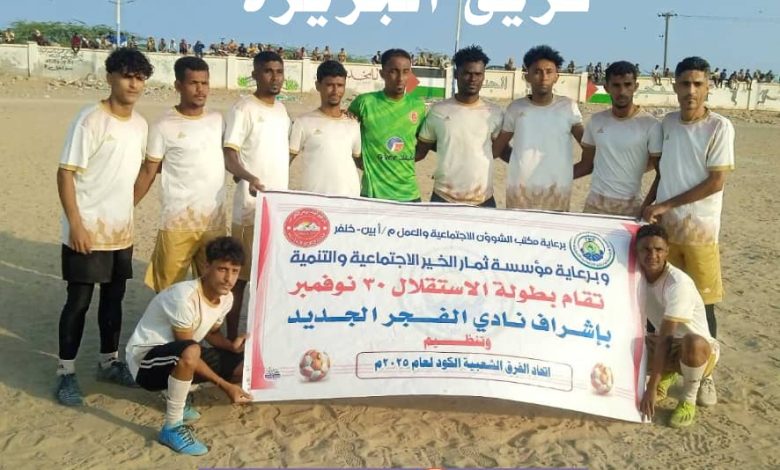 بلغ فريق الجزيرة دور نصف النهائي ليضرب موعداً ناري مع العاصفة في دوري الاستقلال 30نوفمبر للفرق الشعبية بالكود الذي ينظم برعاية مؤسسة ثمار الخير الاجتماعية والتنموية ورعاية مكتب الشوؤن الاجتماعية والعمل محافظة أبين وبإشراف إدارة نادي الفجر الجديد وتنظيم إتحاد الفرق الشعبية بالكود خنفر بعد فوزه على جاره فريق الشعله بركلات الترجيح بعد التعادل السلبي