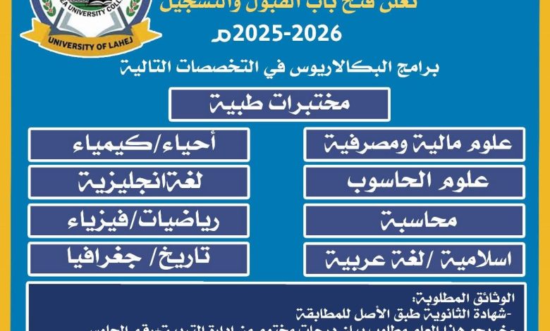 أعلنت كلية يافع الجامعية التابعة لجامعة لحج عن فتح باب القبول والتسجيل للعام الجامعي 2025/2026م لبرنامج البكالوريوس في التخصصات التالية: