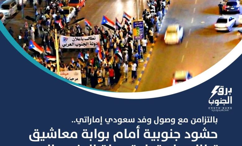 كما دعا المحتشدون الوفد السعودي-الإماراتي إلى الإصغاء لمطالب الشارع الجنوبي، وحماية حق الجنوبيين في تقرير مصيرهم بعيدًا عن ضغوط القوى المعادية للاستقرار، مشددين على أن الجنوب أكثر تماسكًا واستعدادًا من أي وقت مضى لبناء شراكة استراتيجية راسخة مع دول الخليج.