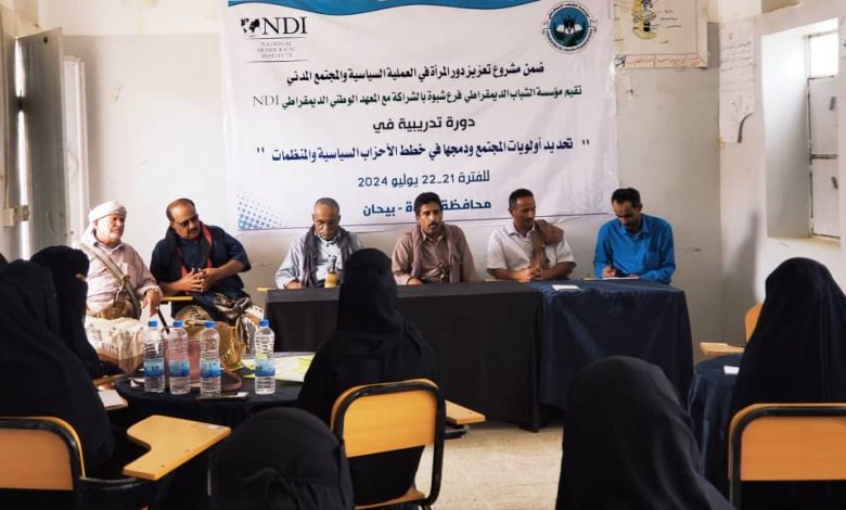 مؤسسة الشباب الديمقراطي بشبوة” تدشن الدورة التدريبية في مجال “تحديد أولويات المجتمع ودمجها في خطط الأحزاب السياسية والمنظمات” بمديرية بيحان .