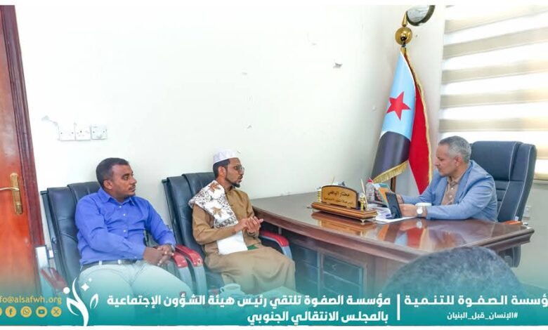 التقى الأستاذ عمر سالم باصم، رئيس مؤسسة الصفوة للتنمية، الأستاذ مختار اليافعي، رئيس هيئة الشؤون الاجتماعية بالمجلس الانتقالي الجنوبي بالعاصمة عدن، بحضور الأستاذ أحمد مشبح، المدير التنفيذي لمؤسسة الصفوة، والأستاذ أحمد باضاوي، مسؤول الإعلام والعلاقات العامة بالمؤسسة.