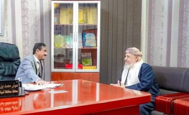 الشيخ باحنحن يشيد بجهود المحافظ ابن الوزير والسعاة ويطلع الرأي العام مستجدات (الخزمة ومواقع النزاع فيها)