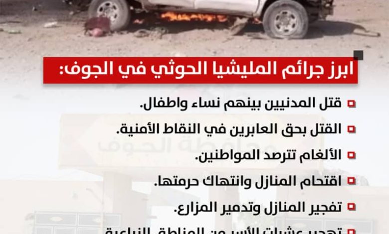 تشهد محافظة الجوف اليمنية جرائم متصاعدة لمليشيا الحوثي، وانتهاكات متواصلة، تجاوزت الحرمات، اقتحام منزل وتصفية أسرة، حوادث القتل المباشر في النقاط والاعتداء على حرمات البيوت وقتل الاطفال والنساء، وغير ذلك تقتل الالغام العابرين والمزارعين في المناطق اصبحت تحت سيطرتها، تهجير المواطنين والاستيلاء على اراضيهم، التضييق على المواطنين في معيشتهم، جرائم متعددة بوجه واحد، وارهاب لن يفل عزيمة ابناء محافظة الجوف الذين يترقبون الانعتاق ليكون الخلاص والثأر من كل من استقوى بعنجهيته، واستعرض باسلحته في لحظة عابرة من الزمن.