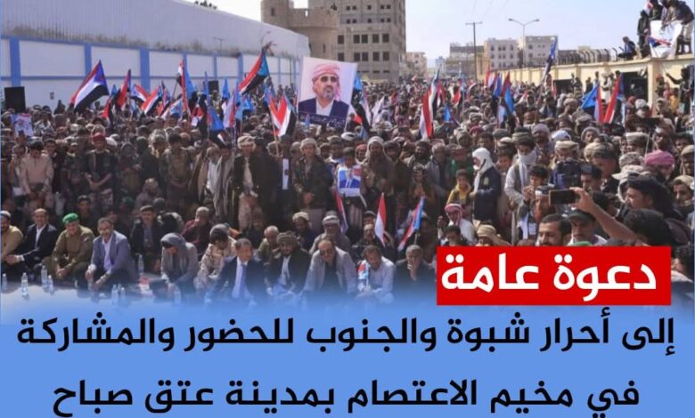 دعت منظمات المجتمع المدني في محافظة شبوة، جماهير المحافظة وأبناء الجنوب كافة، إلى المشاركة في فعالية جماهيرية صباح يوم غدٍ السبت، في مخيم الاعتصام بمدينة عتق.