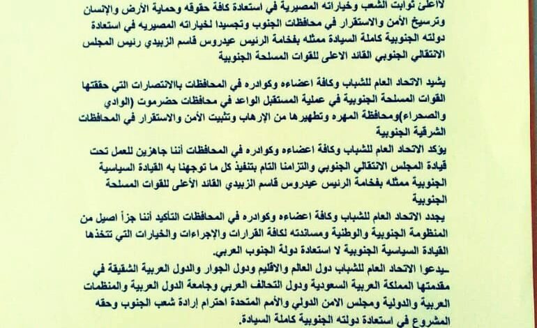 -يعلن الاتحاد العام للشباب وكافة أعضاءه وكودارة في المحافظات تأييده المطلق لكل القرارات السيادية والتاريخية في هذاه المرحلة المفصلية التي تعبر عن الإرادة الحرة لشعب الجنوب لااعلئ ثوابت الشعب وخياراته المصيرية في استعادة كافة حقوقه وحماية الأرض والإنسان وترسيخ الأمن والاستقرار في محافظات الجنوب وتجسيدا لخياراته المصيريه في استعادة دولته الجنوبية كاملة السيادة ممثله بفخامة الرئيس عيدروس قاسم الزبيدي رئيس المجلس الانتقالي الجنوبي القائد الاعلى للقوات المسلحة الجنوبية