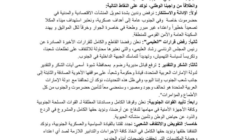 ثانياً: رفض قرارات “العليمي”: نعلن رفضنا القاطع والكامل للقرارات الأخيرة الصادرة عن رئيس المجلس الرئاسي رشاد العليمي، والتي نعتبرها محاولة للالتفاف على تطلعات شعبنا، وتكريساً لسياسة التهميش، وتهديداً لتماسك الجبهة الداخلية في الجنوب.