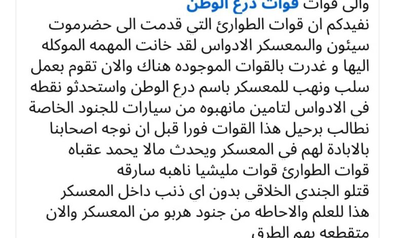 وبحسب ما ورد في منشور المرشدي، فإن قوات الطوارئ الشمالية التي وصلت إلى حضرموت “خانَت المهمة الموكلة إليها”، متهمًا إياها بالقيام بأعمال سلب ونهب داخل معسكر الأدواس “باسم درع الوطن”، إضافة إلى استحداث نقطة أمنية لتأمين ما قال إنه سيارات جرى الاستيلاء عليها من الجنود.