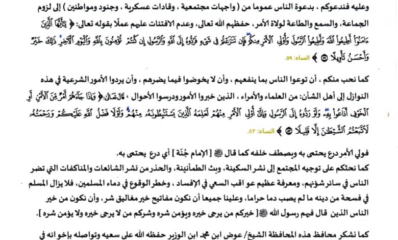 وعليه، فندعوكم، بدعوة الناس عموماً من (واجهات مجتمعية، وقيادات عسكرية، وجنود ومواطنين) إلى لزوم الجماعة، والسمع والطاعة لولاة الأمر، حفظهم الله تعالى، وعدم الافتئات عليهم عملاً بقوله تعالى: ﴿يَا أَيُّهَا الَّذِينَ آمَنُوا أَطِيعُوا اللَّهَ وَأَطِيعُوا الرَّسُولَ وَأُولِي الْأَمْرِ مِنكُمْ ۖ فَإِن تَنَازَعْتُمْ فِي شَيْءٍ فَرُدُّوهُ إِلَى اللَّهِ وَالرَّسُولِ إِن كُنتُمْ تُؤْمِنُونَ بِاللَّهِ وَالْيَوْمِ الْآخِرِ ۚ ذَٰلِكَ خَيْرٌ وَأَحْسَنُ تَأْوِيلًا﴾ (النساء: 59).