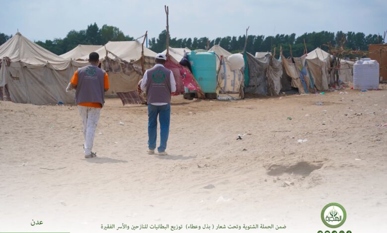 ضمن الحملة الشتوية (بذل وعطاء).. مؤسسة الهجرة توزّع البطانيات للنازحين والأسر الفقيرة في العاصمة عدن