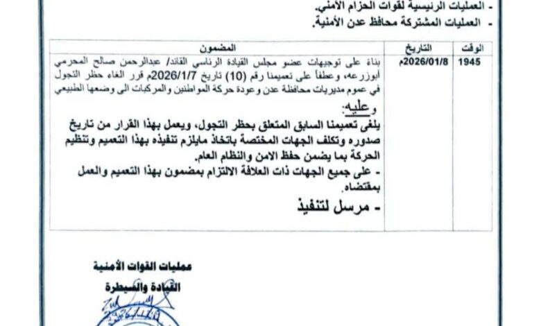 يأتي هذا القرار في ظل استقرار الحالة الأمنية التي تشهدها العاصمة عدن، وتعزيزاً لجهود تطبيع الأوضاع الخدمية والمعيشية، مع التزام الأجهزة الأمنية بمواصلة مهامها في حماية السكينة العامة وصون الاستقرار المنشود.