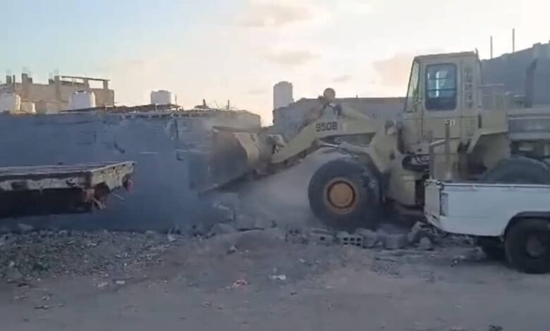وحدة حماية الأراضي بالعاصمة عدن تزيل بناء عشوائي بجعولة دار سعد