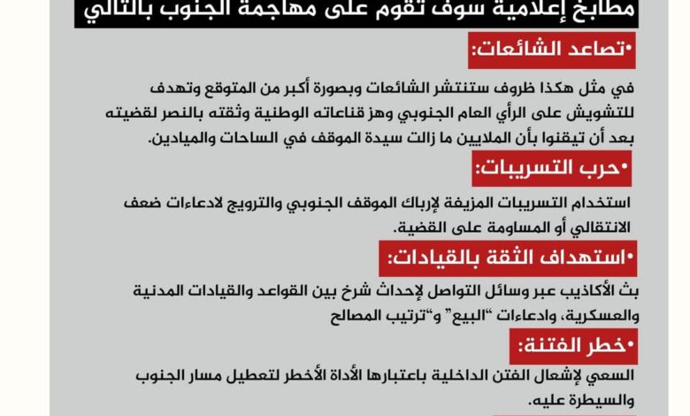 وتشدد المنصة على أن المعركة في هذه المرحلة هي معركة وعي، وأن الحفاظ على وحدة الصف الجنوبي والثقة المتبادلة يمثل خط الدفاع الأول في مواجهة التضليل الإعلامي.