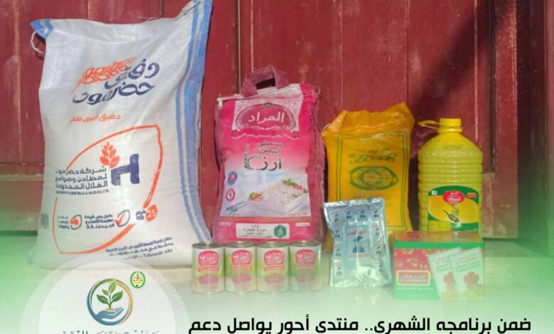 يواصل منتدى أحور الثقافي الاجتماعي الدعوي، وللشهر الثالث على التوالي، عطائه المجتمعي من خلال دعم الأسر المستفيدة من مشروعه الإنساني «صدقة» الخيري، الذي يستهدف عددًا من الأسر الفقيرة المتعففة في مديرية أحور، بدعم من فاعلي الخير.