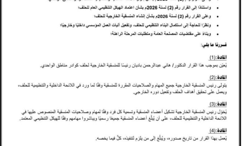 وعلى القرار رقم (2) لسنة 2026م بشأن إنشاء المنسقية الخارجية للحلف، ونظراً للحاجة إلى استكمال البناء التنظيمي للحلف، وتفعيل آليات العمل المؤسسي داخلياً وخارجياً، وبناءً على مقتضيات المصلحة العامة ومتطلبات المرحلة الراهنة؛