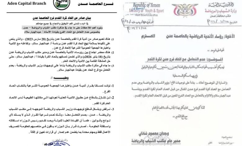 (1) هناك تعميم صادر من أندية كرة القدم بالعاصمة عدن بتاريخ 28) مارس 2023) ، والذي ينص على تأكيدها بسلامة نهج اتحاد كرة القدم عدن برئاسة أ/ عبد الجبار سلام ، وتفاعله مع الاندية باعتبارها الجمعية العمومية الشرعية لإتحاد فرع عدن .