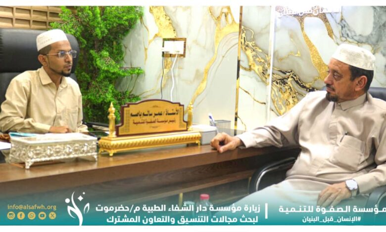 استقبل الأستاذ عمر سالم باصم، رئيس مؤسسة الصفوة للتنمية، في مقر المؤسسة بالعاصمة عدن، وفد مؤسسة دار الشفاء الطبية بمحافظة حضرموت، برئاسة الأستاذ فهمي محمد السقاف، رئيس المؤسسة.