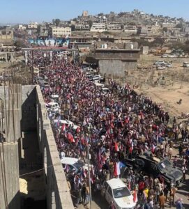 وخرج الحشد الجماهيري عقب ذلك بمسيرة حاشده جابت شوارع عاصمة المحافظة ردد من خلالها الشعارات التي تؤكد تمسك أبناء الجنوب بالرئيس عيدروس بن قاسم الزُبيدي ممثلاً سياسياً ومفوضاً شعبياً، وبالمجلس الانتقالي الجنوبي حاملاً سياسياً معبراً عن إرادة غالبية شعب الجنوب، والإصرار على مواصلة النضال وعدم المساومة أو القبول بإنصاف الحلول، والتمسك بحق الشعب الجنوبي في إدارة أرضه وحماية حدوده بقواته المسلحة الجنوبية.