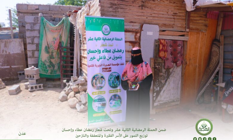 مؤسسة الهجرة توزّع التمور على الأسر الفقيرة والمتعففة والنازحين والمساجد بالعاصمة عدن ولحج وأبين