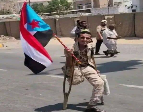 الشاب المناضل والمقاوم علوي عبدالله حسن اليافعي.. برجل واحدة فقط، ومع قلب يفيض بالإرادة، يقف الشاب الجنوبي الذي فقد نصف ساقه في معارك تحرير عدن من غزو اليمني الحوثي عام 2015، اليوم في مقدمة مسيرة سلمية لفتح مقرات المجلس الانتقالي ورفض هيمنة سلطة الاحتلال اليمني والواقع المفروض.