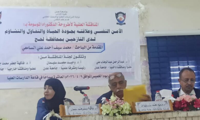 شهدت قاعة الدراسات العليا بكلية الآداب في جامعة عدن، يوم الخميس الموافق 9 أبريل 2026م، جلسة علمية لمناقشة أطروحة دكتوراه حملت عنوان: “الأمن النفسي وعلاقته بجودة الحياة والتفاؤل والتشاؤم لدى النازحين بمحافظة لحج”، المقدمة من الباحث محمد سيف أحمد السامعي، ضمن متطلبات نيل درجة الدكتوراه في علم النفس من كلية الآداب جامعة عدن.