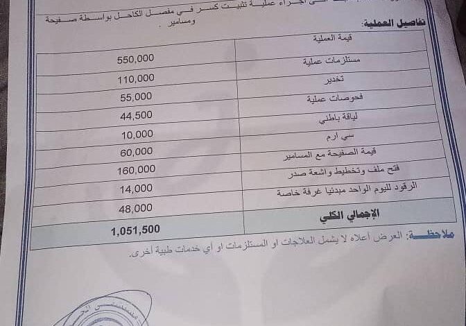 وبحسب التقرير الطبي الصادر من مستشفى الجزيرة بالعاصمة عدن بتاريخ 13 أبريل 2026م، فقد قُدّرت تكلفة العملية والعلاج بمبلغ إجمالي وقدره 1,051,500 ( مليون وواحد وخمسون الف وخمسمائة )ريال يمني، وهو مبلغ يفوق الإمكانيات المادية للمريضة وأسرتها.