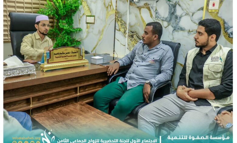 عقدت اللجنة التحضيرية لمهرجان الصفوة للزواج الجماعي الثامن لعام 2026م، الموافق 1448هـ، اجتماعها الأول برئاسة الأستاذ عمر سالم باصم، رئيس مؤسسة الصفوة للتنمية، ورئيس اللجنة التحضيرية.