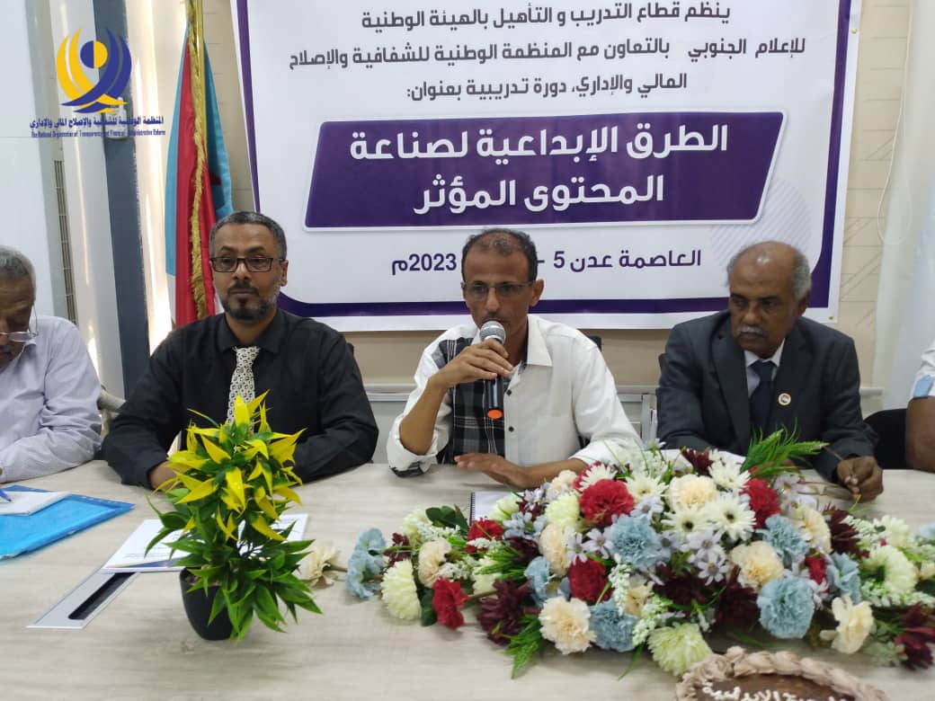 بحضور الأستاذ/ صالح محمود وكيل وزارة الشؤون الاجتماعية والعمل لقطاع الرعاية اختتمت المنظمة الوطنية للشفافية والإصلاح المالي والإداري هذا اليوم دورتها التدريبية للمجموعة الأولى بعنوان “الطرق الإبداعية لصناعة المحتوى المؤثر” والتي كانت بالتعاون مع قطاع التدريب والتأهيل للهيئة الوطنية للاعلام الجنوبي والتي استمرت طيلة خمسة أيام من 4 – 9 فبراير 2023م،
