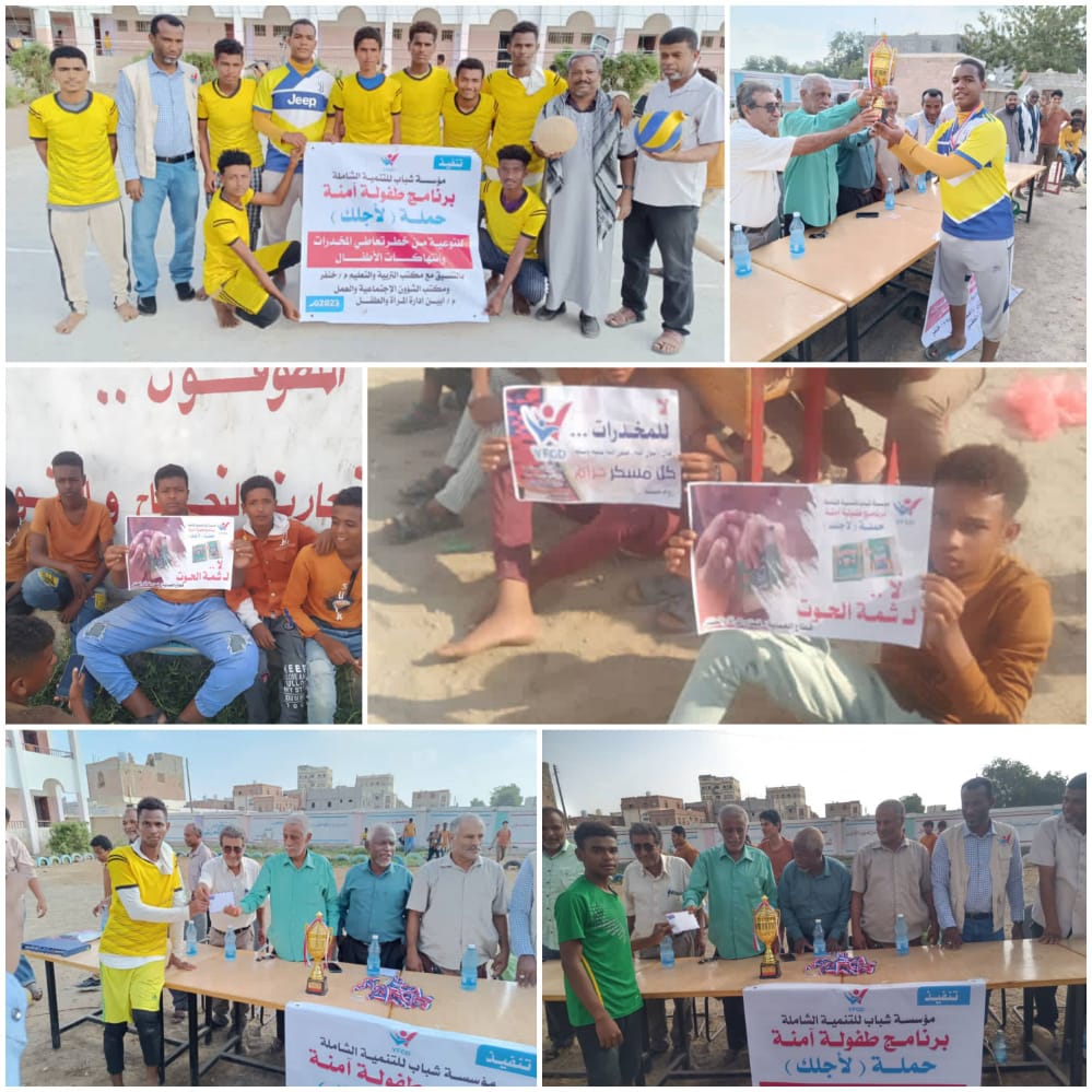 اختتمت مؤسسة شباب للتنمية الشاملة قطاع المرأة والطفل وقطاع الحماية بالتنسيق مع مكتب التربية والتعليم / خنفر ومكتب الشؤون الاجتماعية والعمل / أبين أدارة المرأة والطفل برنامج طفولة أمنة حملة( لأجلك) للتوعية من خطر تعاطي المخدرات والانتهاكات الاطفال بتوعي ة 251 طالب للفئة العمرية من ١٥ الى ١٨سنه وختام النشاط المساند للتوعية دوري الطائرة الذي كان برعاية المؤسسة بفوز فريق سنة ثاني علمي واخذ كأس بطولة البرنامج وكما تتقدم ادراة مؤسسة شباب للتنمية الشاملة بالشكر والتقدير للاستاذ / محمود سبعة ومدير الثانوية الأستاذ / محسن سالم علي والاستاذ الاخصائي الاجتماعي مقدم حلقات التوعية / نجيب محفوظ و مسؤول الانشطة الرياضية في الثانوي منظم الدوري الاستاذ / رياض البديلي لكل جهودهم الرائعة في مساندة البرنامج وكما حضر الختام الاستاذ/ سالم سعيد رئيس قسم التدريب والتأهيل مكتب التربية خنفر والاستاذ/ شيخ نصر البعسي عضو مجلس الاباء والاستاذ / عبد عوض هادي ممثل عن الانتقالي مركز (أ) والكابتن ممدوح شابص ومحكمين الدوري الأستاذ/ رفعت محمد سالم والاستاذ / عبدالله بن عبدالله