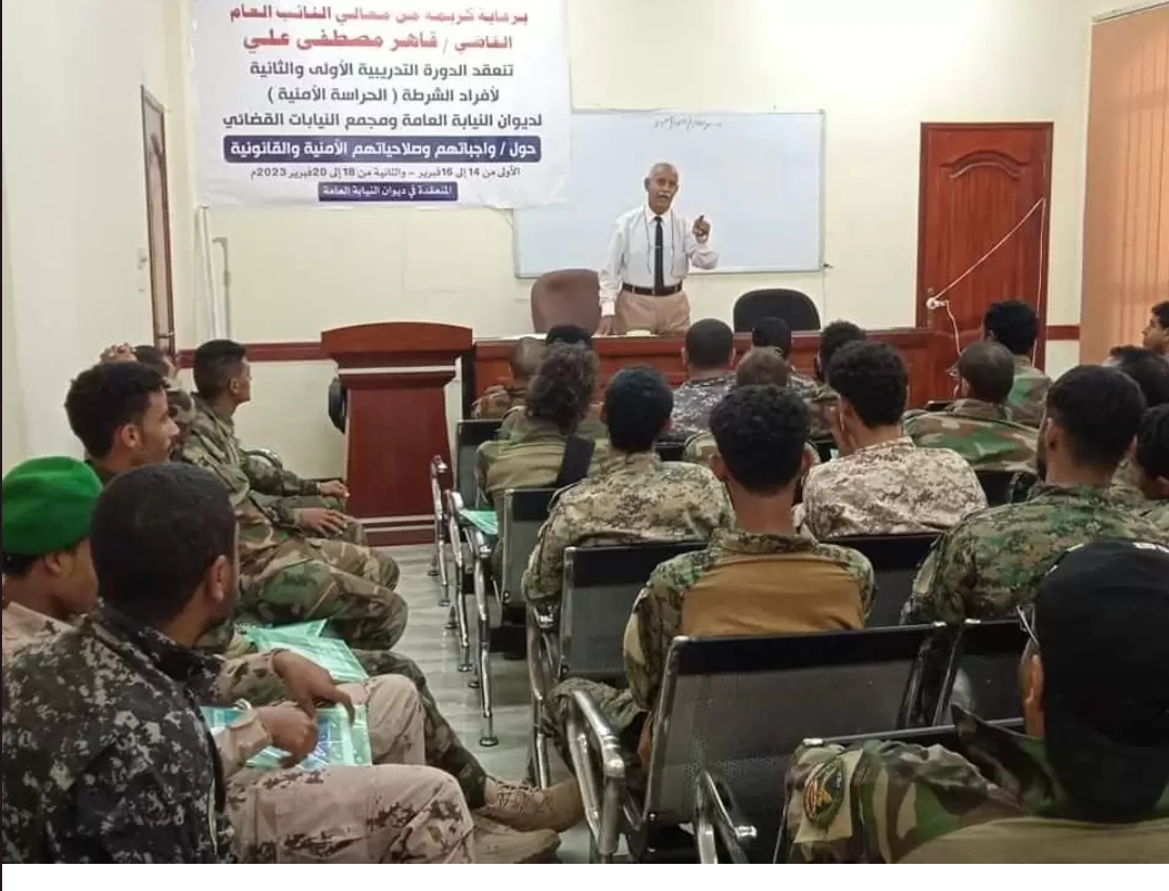دشنت اليوم في ديوان النيابة العامة بالعاصمة عدن الدورة التدريبية الأولى والثانية لأفراد الشرطة (الحراسة الأمنية) لديوان النيابة العامة ومجمع النيابات القضائي، خلال الفترة من 14 إلى 16 يناير، والثانية من 18 إلى 20 فبراير 2023.