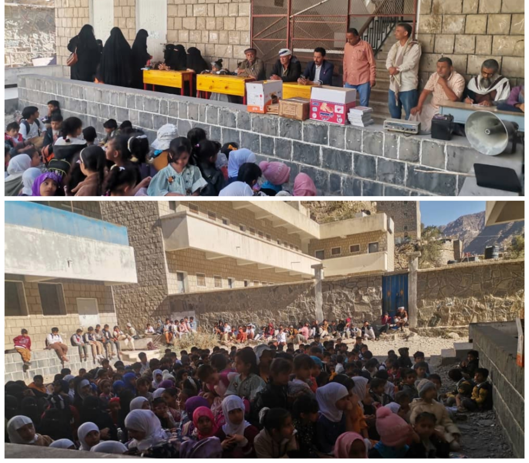 وقدم التهاني لاستاذ محضار بنيلة ثقت القيادة السياسية وترقيته إلى مدير عام المديريه.. كما طالب جميع الطلاب والطالبات بمواصلة مشوارهم التعليمي وتحقيق معدلات كبيرة خلال الفترة القادمة ، وقاموا بعدها بتكريم الطلاب والطالبات المتفوقين الخمسة الأوائل من كل صف وتوزيع لهم شهادات تفوق وشكر وتقدير لما بذلوه من جهود خلال الفصل الدراسي الأول وجوائز تحفيزية لطلاب من الصف الأول إلى الصف أول ثانوي .