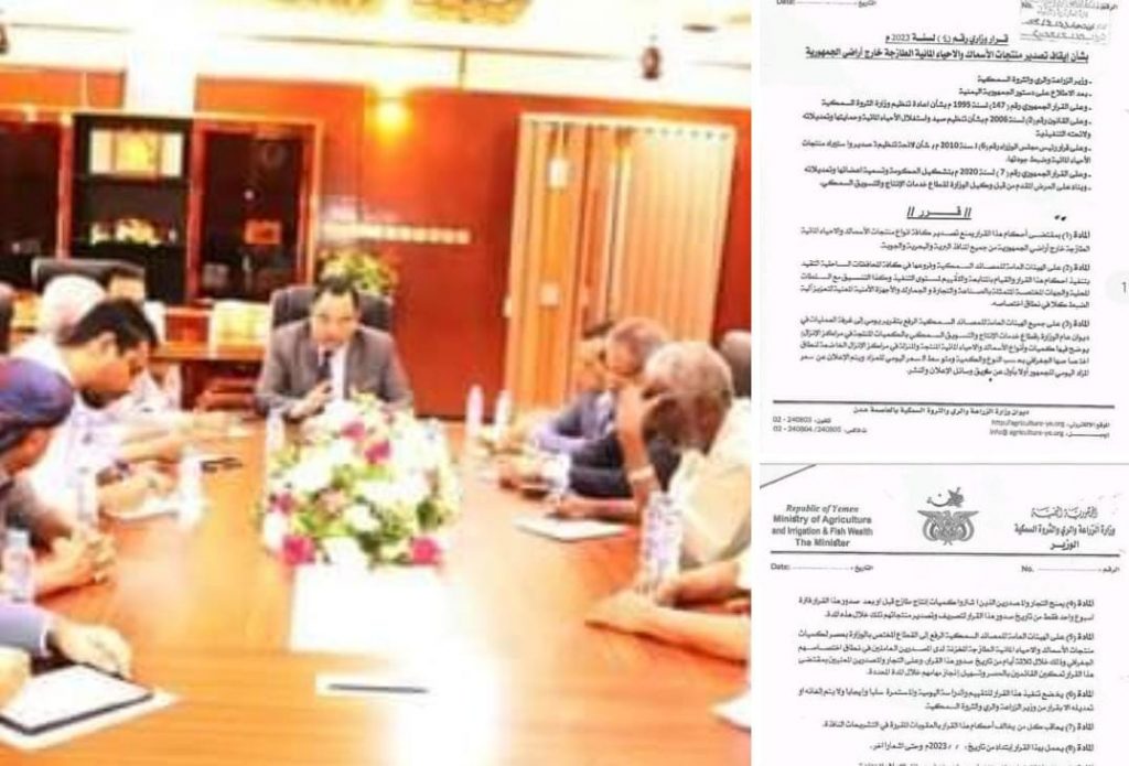 وفي هذا الاطار أصدر وزير الزراعة و الثروة السمكية اللواء / سالم السقطري قرارا وزاريا بوقف تصدير منتجات الاسماك والاحياء البحرية الطازجة الى خارج اراضي الوطن ومن جميع المنافذ البرية والبحرية والجوية،ونصت المادة الثانية منه على قيام الهيئات العامة للمصائد السمكية وفروعها في المحافظات تنفيذ القرار والتنسيق مع السلطات المحلية والجهات المختصة( الصناعة والتجارة والامن والجمارك) للتنفيذ ورفع تقرير يومي الى غرفة العمليات يوضح فيه كميات وانواع الاسماك في مراكز الانزال ، ويمنح التجار والمصدرين فترة اسبوع من تاريخ صدور القرار لتصريف وتصدير منتجاتهم،