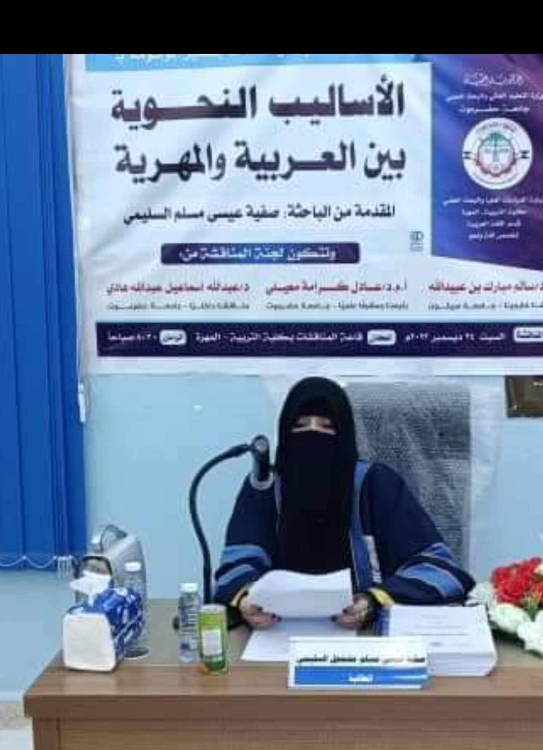 حيث دافعت الطالبة صفية السليمي، عن رسالتها الموسومة ب(الأساليب النحوية بين العربية والمهرية)، وأجيزت الرسالة من قبل لجنة المناقشة، وحصلت الباحثة على درجة الماجستير في النحو واللغة بتقدير ممتاز.