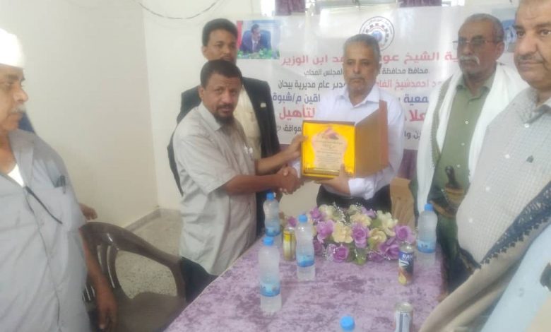 وقد قدم مدير عام المديرية” درع الوفاء للأمين العام لجمعية رعاية وتأهيل المعاقين، رئيس مركز العلاج الطبيعي بشبوة” وذلك تقديراً لجهودهم في العمل ودعمهم لنجاح افتتاح المركز في المديرية.