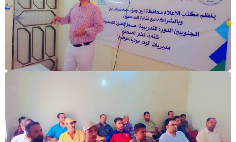 شهدت قاعة مؤسسة نور الإبداع بمديرية مودية إنعقاد الدورة التدريبية مدخل للفنون الصحفية ” فن كتابة الخبر الصحفي والذي ينظمها مكتب الإعلام محافظة أبين ومؤسسة شباب أبين وبالشراكة مع نقابة الصحفيين والإعلاميين الجنوبيين محافظة ابين ، وتحت رعاية محافظ محافظة ابين اللواء ابوبكر حسين سالم ، ومشاركة عدد20 صحفيا” من مديريات المنطقة الوسطى “لودر -مودية – الوضيع” وتستمر لمدة يومين .