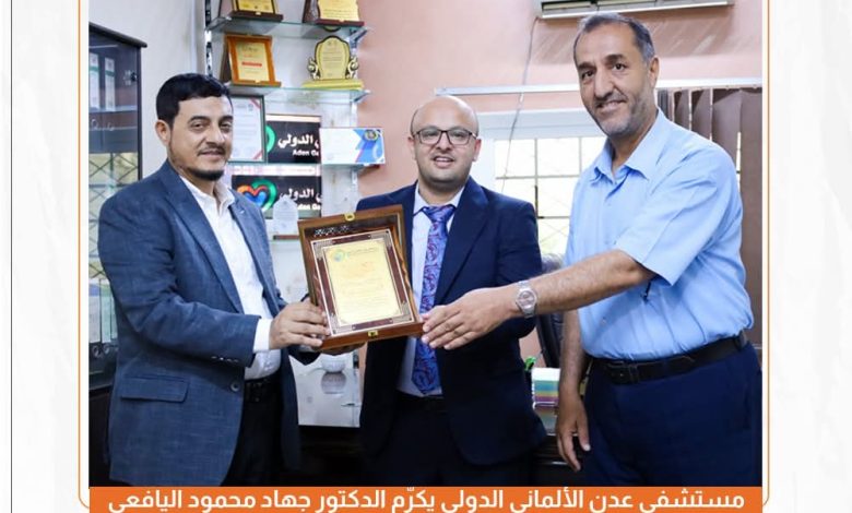 مستشفى عدن الألماني الدولي يكرّم الدكتور جهاد اليافعي تقديراً لجهوده الطبية والإنسانية