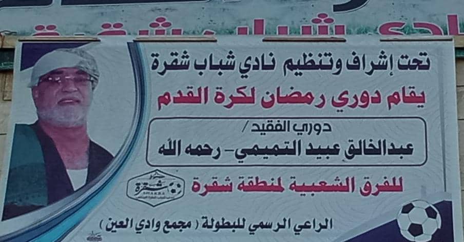 تتقدم اللجنة المنظمة والمسيرة للبطولة الرمضانية بعظيم الشكر والعرفان للشيخ/ فهمي عبدالخالق عبيد التميمي الراعي الرسمي لبطولة الفقيد الشيخ/عبدالخالق عبيد التميمي رحمه الله الرمضانية للفرق الشعبية على إقامته ودعمة السخي لمثل هذة البطولات الرياضية في مدينة شقرة وحضورة وتشريفة لأحدى المباريات والتي أعطت روح معنويه وأنعكس إيجاباً على لاعبي الفرق المشاركة في البطولة