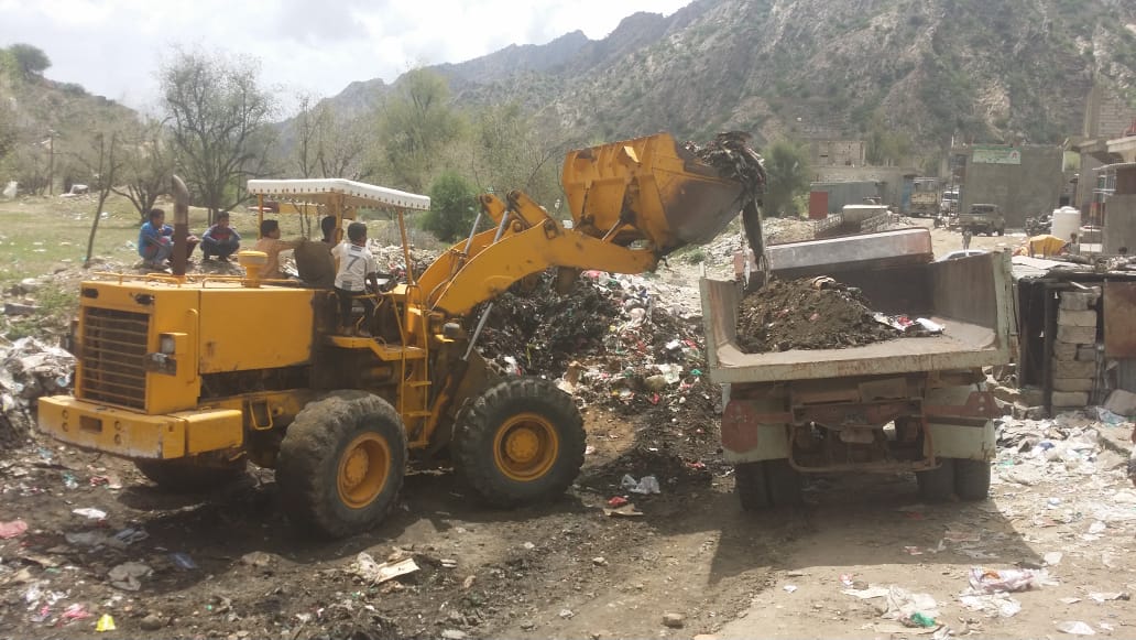 مدير عام سرار بيافع يشرف على أعمال ازالة مقلب القمامة من مدخل سوق المديرية.
