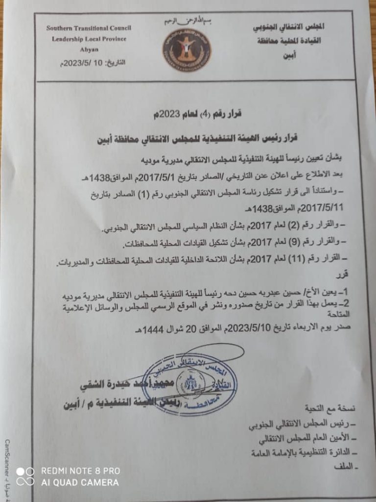 قرار رئيس الهيئة التنفيذية للمجلس الانتقالي الجنوبي محافظة أبين
