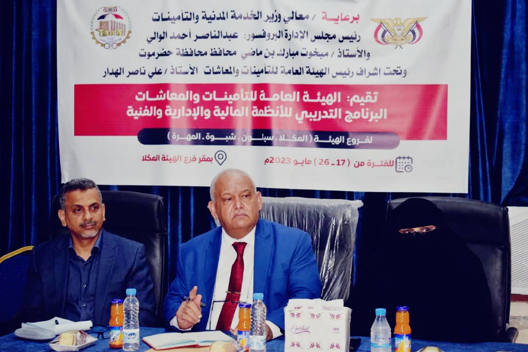 إلى جانب ذلك شهد وزير الخدمة المدنية والتأمينات البرفيسور عبد الناصر الوالي، ومعه وكيل المحافظة للشؤون الإدارية والمالية، الدكتور أحمد باصريح البرنامج التدريبي للأنظمة المالية والإدارية والفنية لموظفي الهيئة العامة للمعاشات فرع ( المكلا- سيئون- شبوة – المهرة ) التي تنظمه فرع الهيئة العامة للمعاشات بالمكلا من الفترة 17 – 26 مايو 2023م.