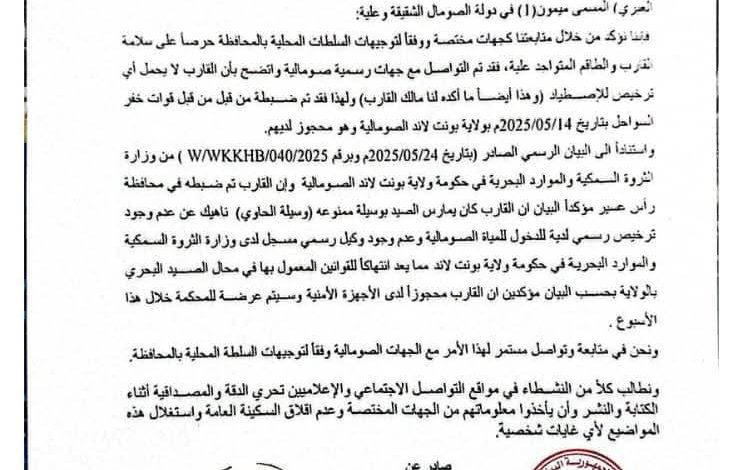 وبيّن البيان أن القارب تم رصده من قبل الجهات المختصة الصومالية وهو يمارس الصيد بصورة غير مشروعة، دون وجود أي مستندات رسمية صادرة من الجهات اليمنية المعنية، بما في ذلك سجل قيد القارب في وزارة الثروة السمكية، ما اعتبر مخالفة واضحة للقوانين البحرية.