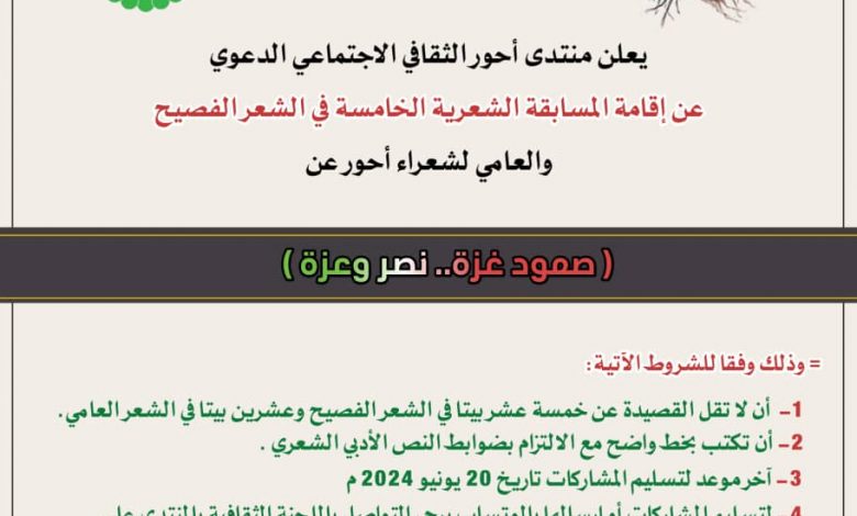 منتدى أحور الثقافي يعلن عن إقامة المسابقة الشعرية الخامسة في الشعر الفصيح والعامي