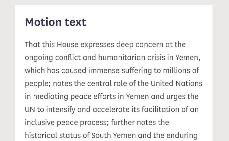 ويُنظر إلى هذه الخطوة على أنها تطور بارز في موقف البرلمان البريطاني تجاه القضية الجنوبية، وتمهيد لمناقشات أوسع داخل أروقة البرلمان حول سبل دعم السلام الشامل في اليمن وضمان تمثيل الجنوب في أي مفاوضات قادمة.